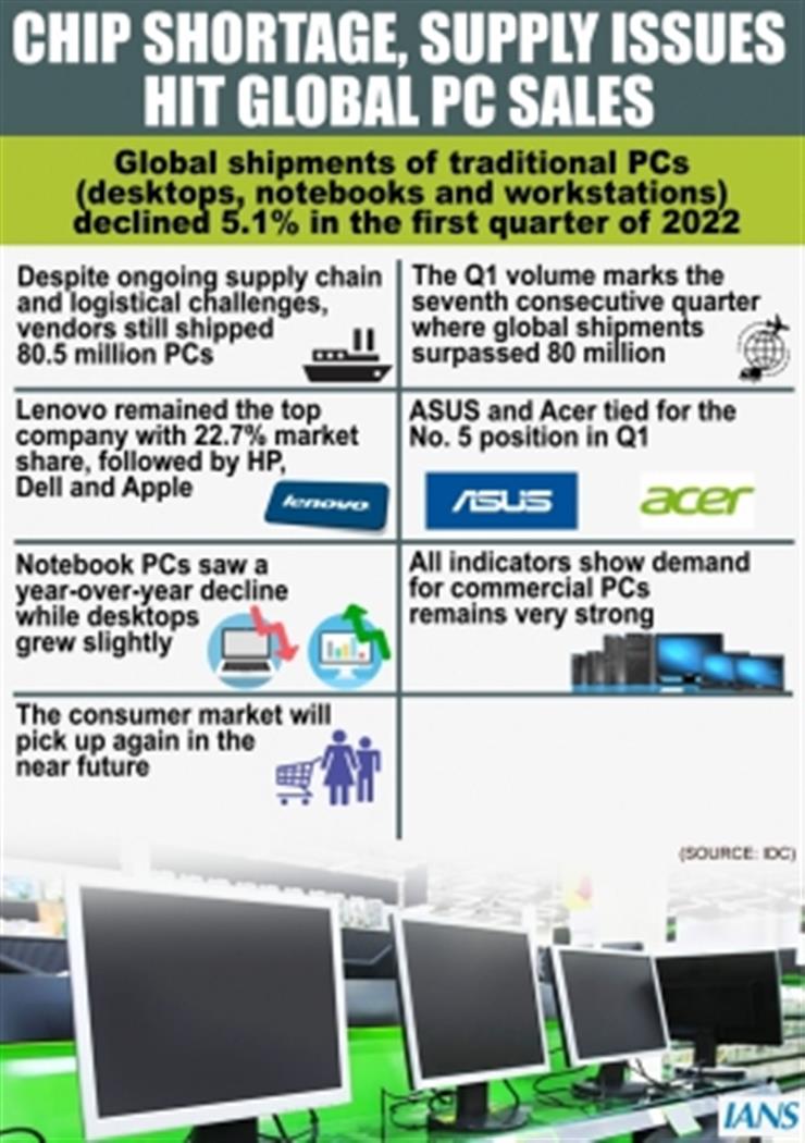 SAN FRANCISO: The global shipments of traditional PCs declined 5.1 per cent in the first quarter of 2022 but exceeded earlier forecasts, says a new report.