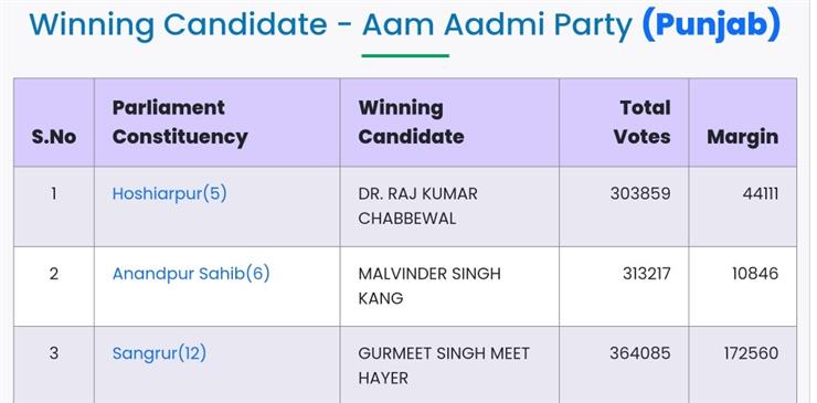 CHANDIGARH: The Aam admi Party(AAP) has won three seats in Punjab, much below the expectations of Chief Minister Bhagwant Mann who had set the target of winning all the 13 seats. The Sangrur seat, the home district of CM was considered a high stake seat for AAP and its candidate Gurmeet Singh Meet Hayer has lived up to party's expectations.