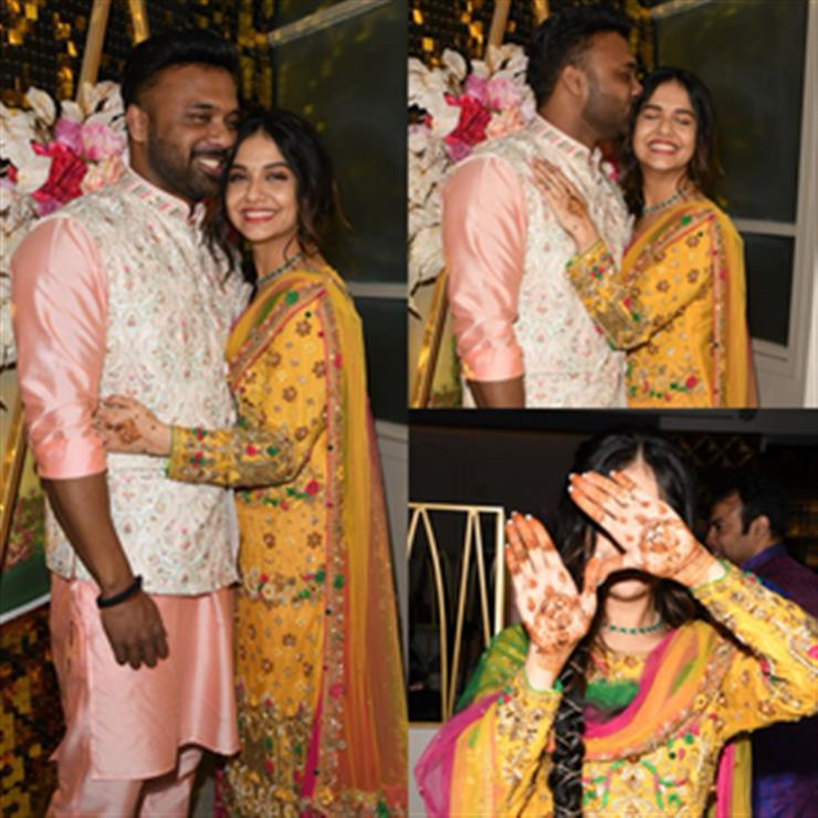 The mehendi ceremony which was held at her residence, after the grand cocktail night, features the ‘MTV Ace of Space 1' winner in a heavily embroidered Punjabi outfit -- a yellow long kurta, red sharara, and a multicoloured transparent dupatta.