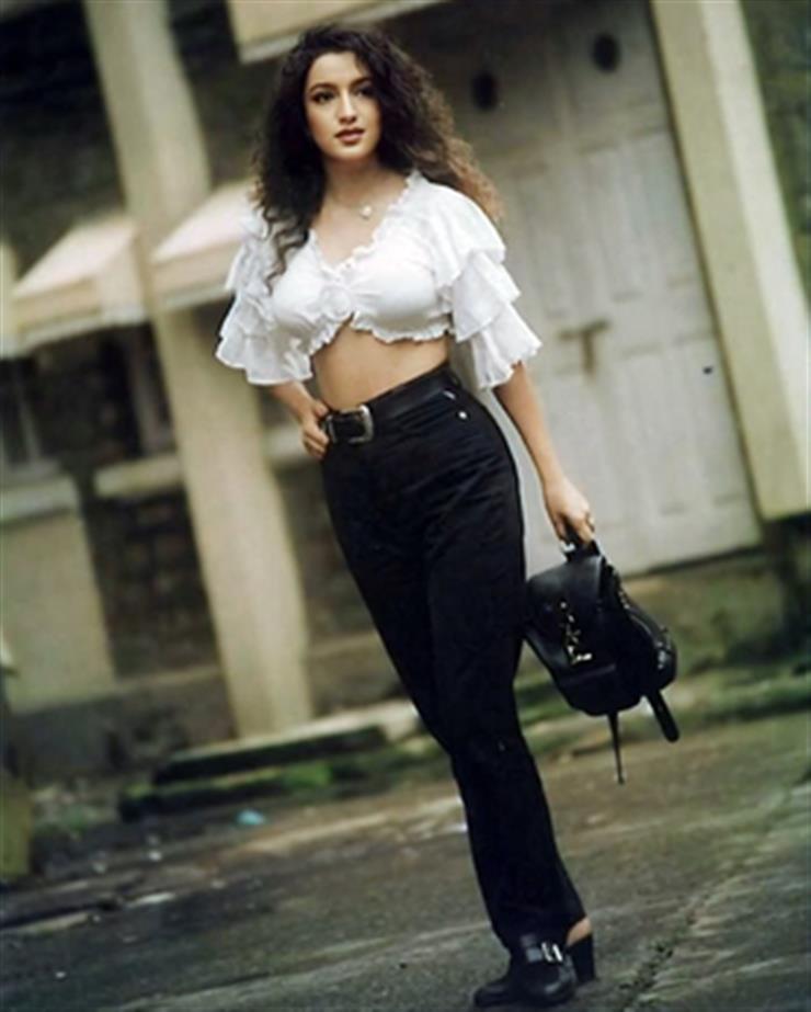 She is wearing a stylish white crop top with ruffled sleeves and a plunging neckline, paired with high-waisted black jeans secured with a black belt. She completed her look with black boots and carried a small black backpack in one hand.