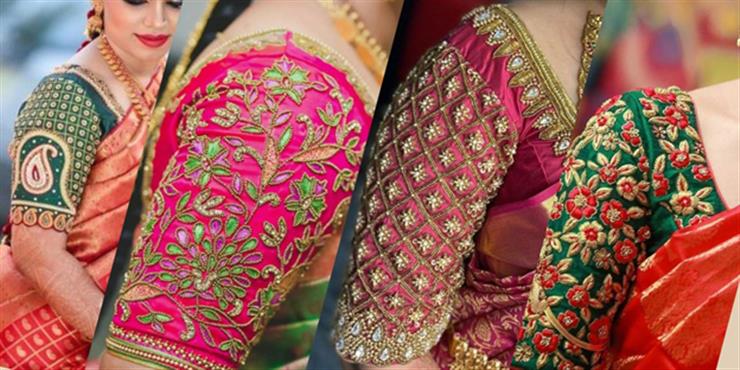 Backless or deep-neck blouses with aari embroidery – To get the requisite look of bold and elegant.