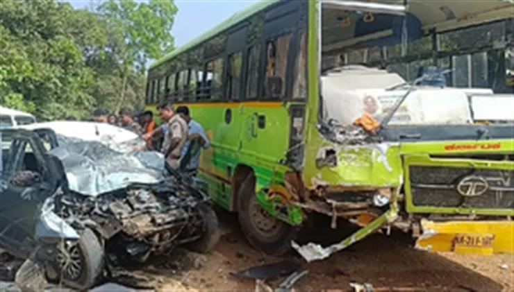 KARNATAKA: Five persons were killed and several others injured in a head-on collision between a bus and a car near Bandal village in Sirsi taluk of the state on Friday.
