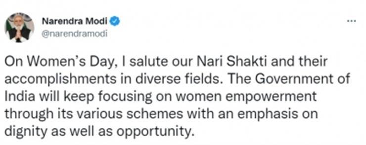 In a series of tweets on 'International Women's Day', the Prime Minister said, "On Women's Day, I salute our Nari Shakti and their accomplishments in diverse fields. The Government of India will keep focusing on women empowerment through its various schemes with an emphasis on dignity as well as opportunity.