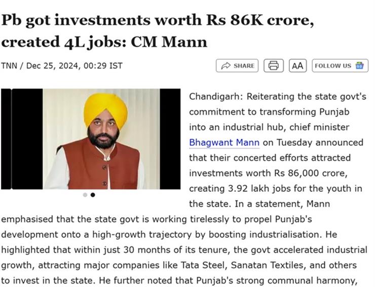 On the investment front Chief Minister had many times claimed that new investment of crores of rupees had came to Punjab after AAP came to power. On December 25, 2024, Bhagwant Mann in a statement reiterated that state govt's commitment to transforming Punjab into an industrial hub, their concerted efforts attracted investments worth Rs 86, 000 crore, creating 3.92 lakh jobs for the youth in the state. The major companies like Tata Steel, Sanatan Textiles, and others committed to invest in the Punjab. Were these claims of investment were fake ?