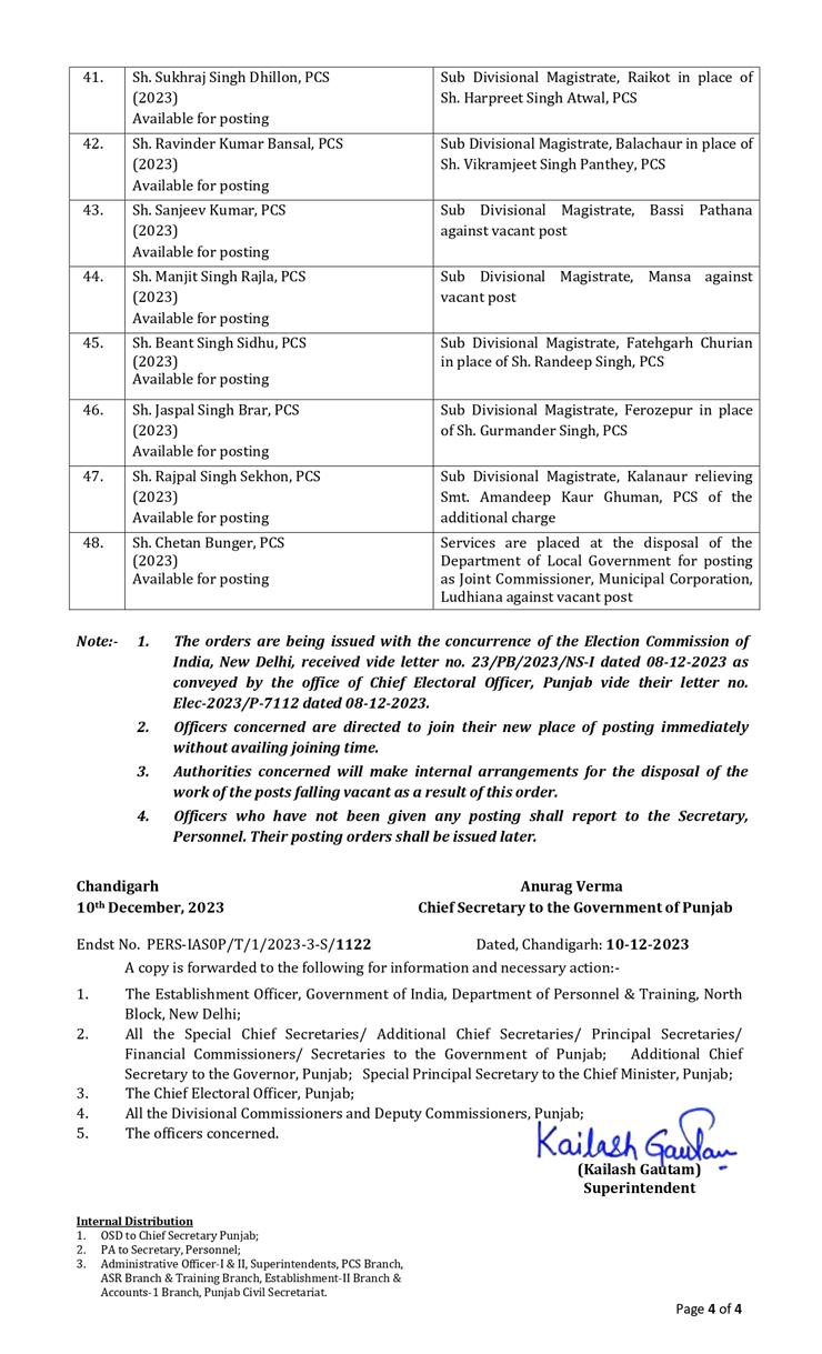 CHANDIGARH: Punjab Government today transferred 48 IAS andPCS officers in a major reshuffle in the state administration. Following is the list of officers shifted to new places: