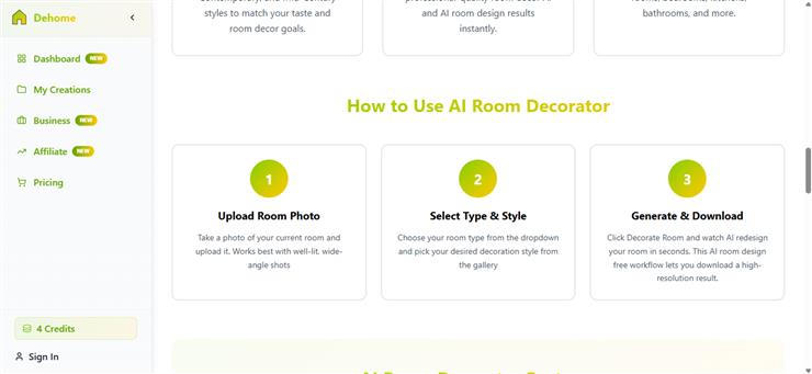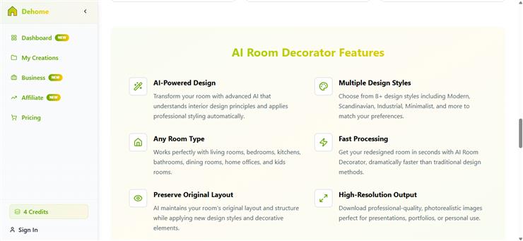 DeHome.ai prioritises your home design process when it comes to simplicity and speed. You can get a professional look with a few simple clicks.