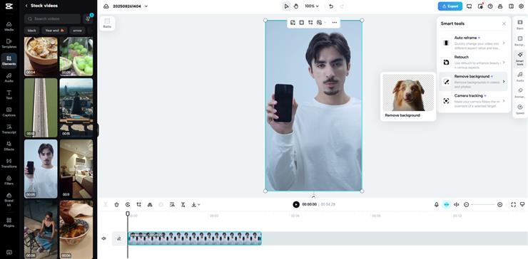 Upload your video and highlight it. Select "Smart tools" from the right vertical menu bar and then click on the "Remove background" tool. Use auto removal or Chroma key for manual edits. CapCut removes video background in one click, letting you place multiple layers with custom colors, images, or video clips for complex edits.